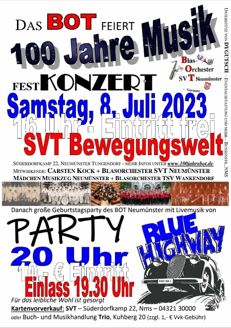 Festakt und Party wurde am 8.Juli 2023 gefeiert! Mitdem BOT und dem Ehemaligenorcheterprojekt des BOT, dem MMN, dem BOW, Carsten Kock und Blue Highway! Mehr dazu ist hier zu finden: Festakt und Party